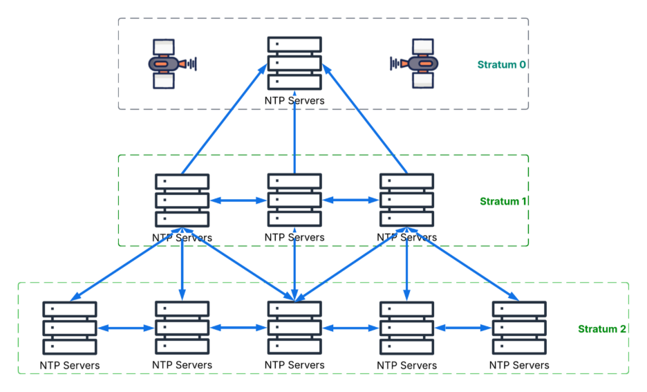 - Stratum 0: Reference clocks (e.g., GPS, atomic clocks)