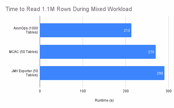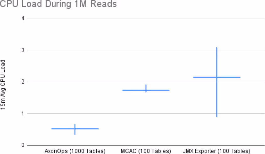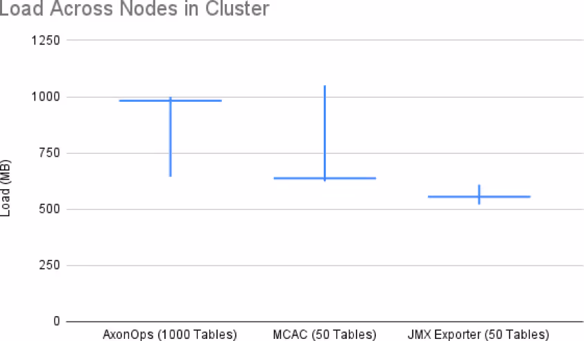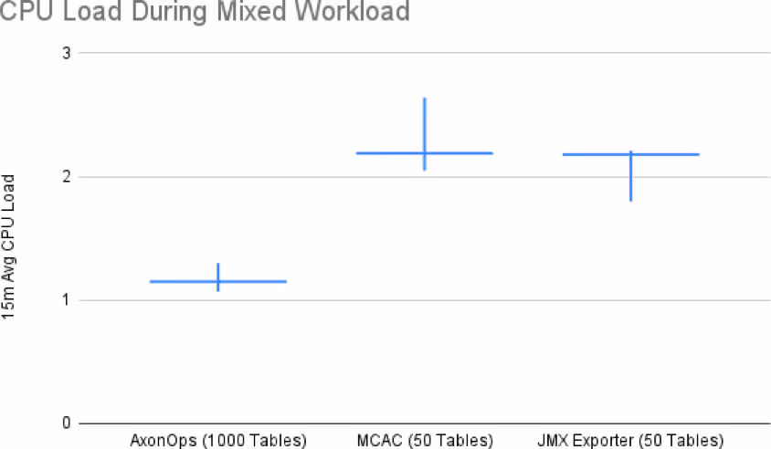 The JMX Exporter could barely monitor 100 tables, while the MCAC exporter could comfortably monitor 300 idle tables within the test environment. The AxonOps agent, on the other hand, could easily monitor more than 1000 tables while causing a 15-minute average load of around 0.33.