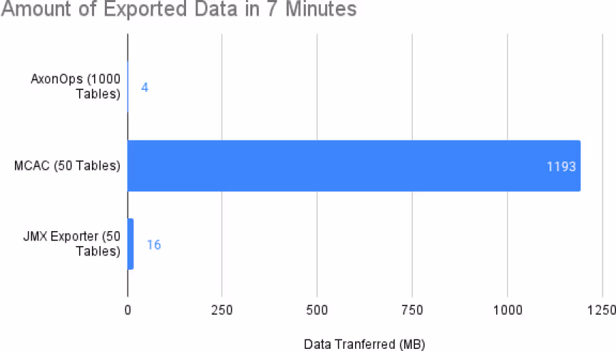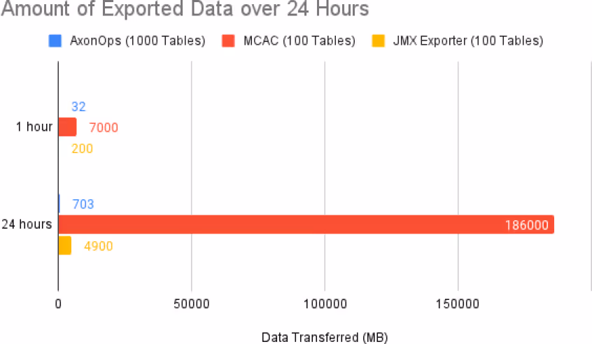 MCAC, however, was a data firehose, sending 19.2 GB of data over 1 hour and 236 GB over 12 hours when monitoring 100 tables. By comparison, this is about 4,000x more data than what the AxonOps agent exports. This bandwidth would ideally be used to serve public requests, not gather internal health metrics while potentially increasing bandwidth charges.