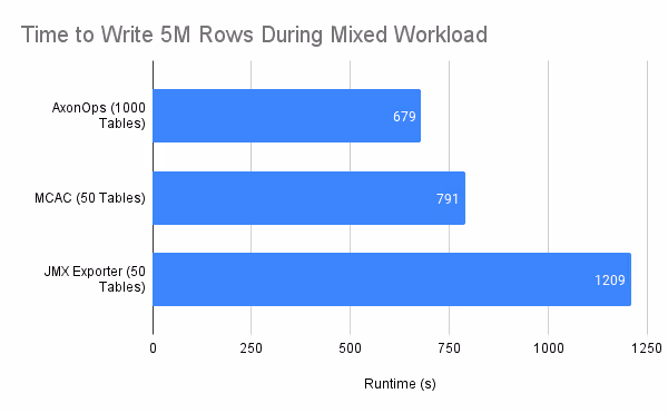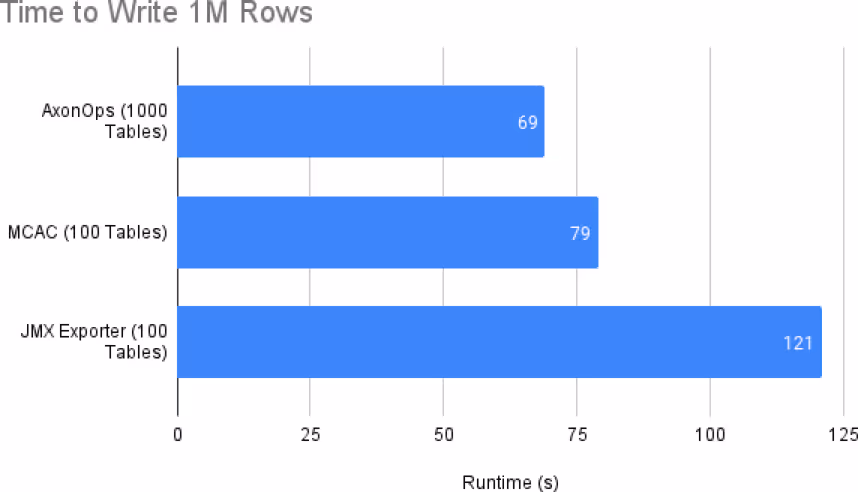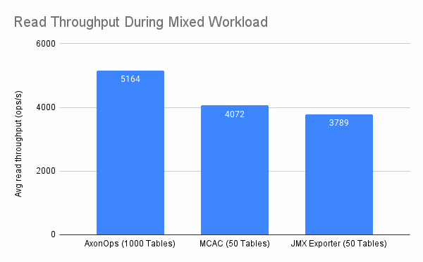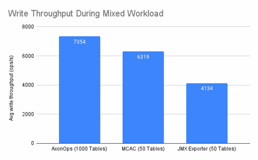 The write throughput of the MCAC exporter looks comparable to the AxonOps agent when the number of tables being monitored is kept low. However, the following issues with the MCAC exporter are noteworthy when making final comparisons since the MCAC exporter:
