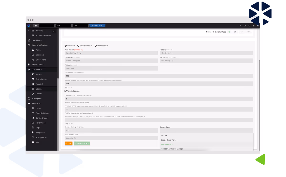 Cassandra snapshots are quick and efficient through storing only the backup changes thereby ensuring costs do not spiral. Configure your snapshots to be uploaded to the following supported storage platforms: Local filesystem, SSH/SFTP, S3, GCP, Azure blob.